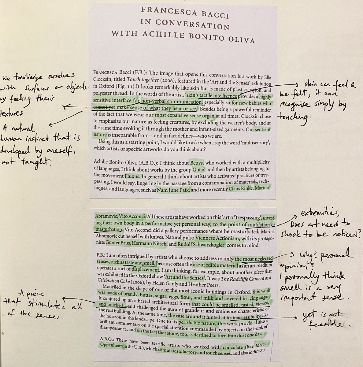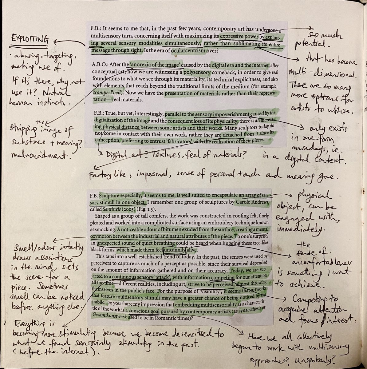 I have narrowed down my brainstorm to a more general idea regarding the human senses. Although I know this topic is quite a widely explored one with artists and students, I feel as if there is a lot of scope in just the title that I can use as a starting point to a final product. Currently what I’m thinking of is to conduct research on all the five human senses and how I might be able to stimulate them through a work of art. I will be looking for examples of artists who have used multi sensory practices in their work. at the moment I’m not sure whether or not to narrow down my research to just one or two of the senses that I find most important, because this might refine my search and allow me to expand on one idea as opposed to five. I feel as if the senses that would provide the most possibility would be touch and sight, particularly because this would be more feasible when it comes to making a physical piece of work. I’m considering making an immersive piece or even just an interactive piece that the audience can engage with physically so that they are able to experience firsthand the sensations that I am trying to communicate.