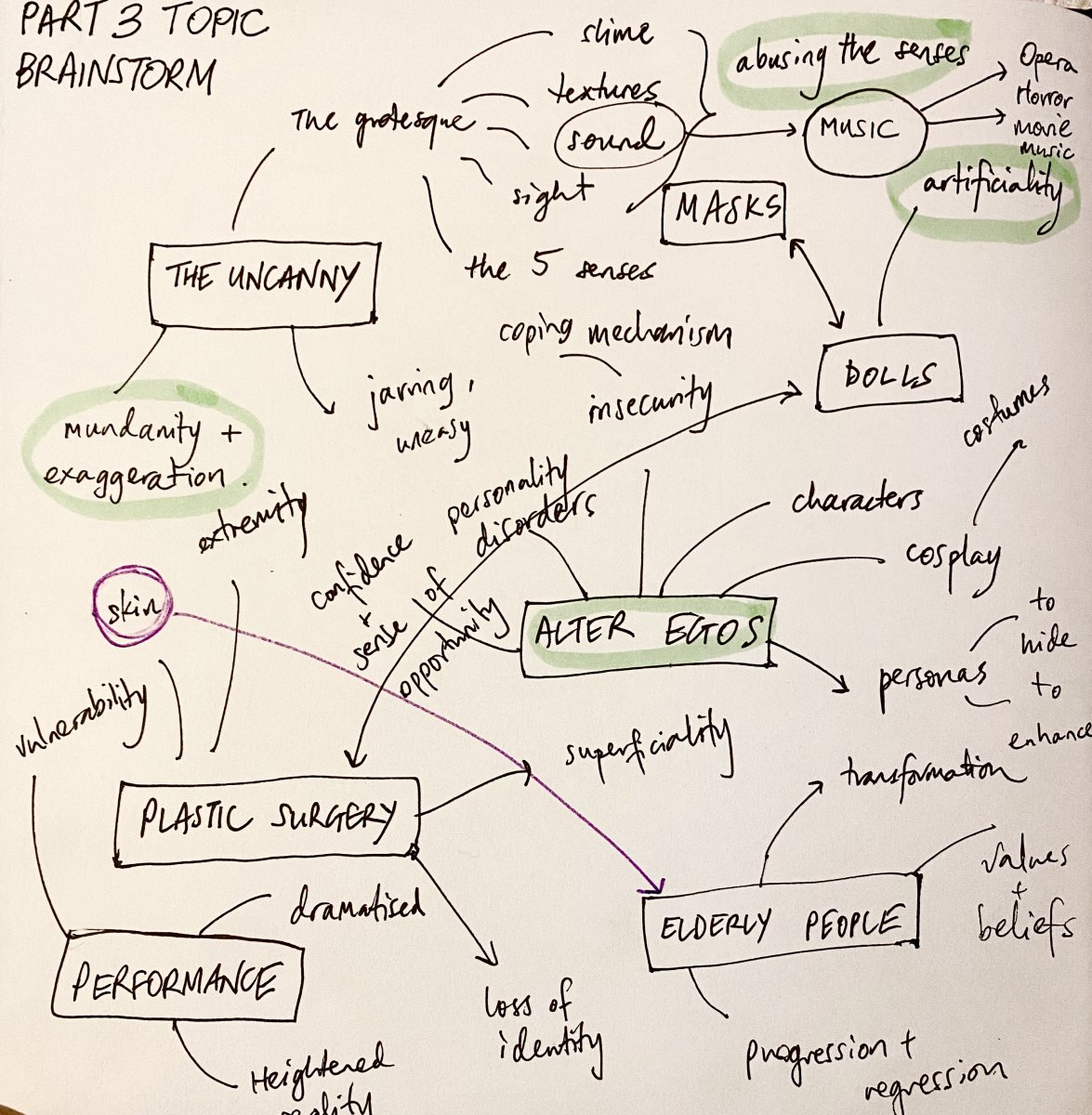 Choosing a topic to focus my part 3 project on has been quite challenging so far. I am realising that most of my interests relate to one another and can therefore be grouped together, which is making it hard for me to settle on one concept. I am also hesitant to choose a topic that I have explored previously because I am worried about becoming a cliché and not stepping out of my comfort zone.