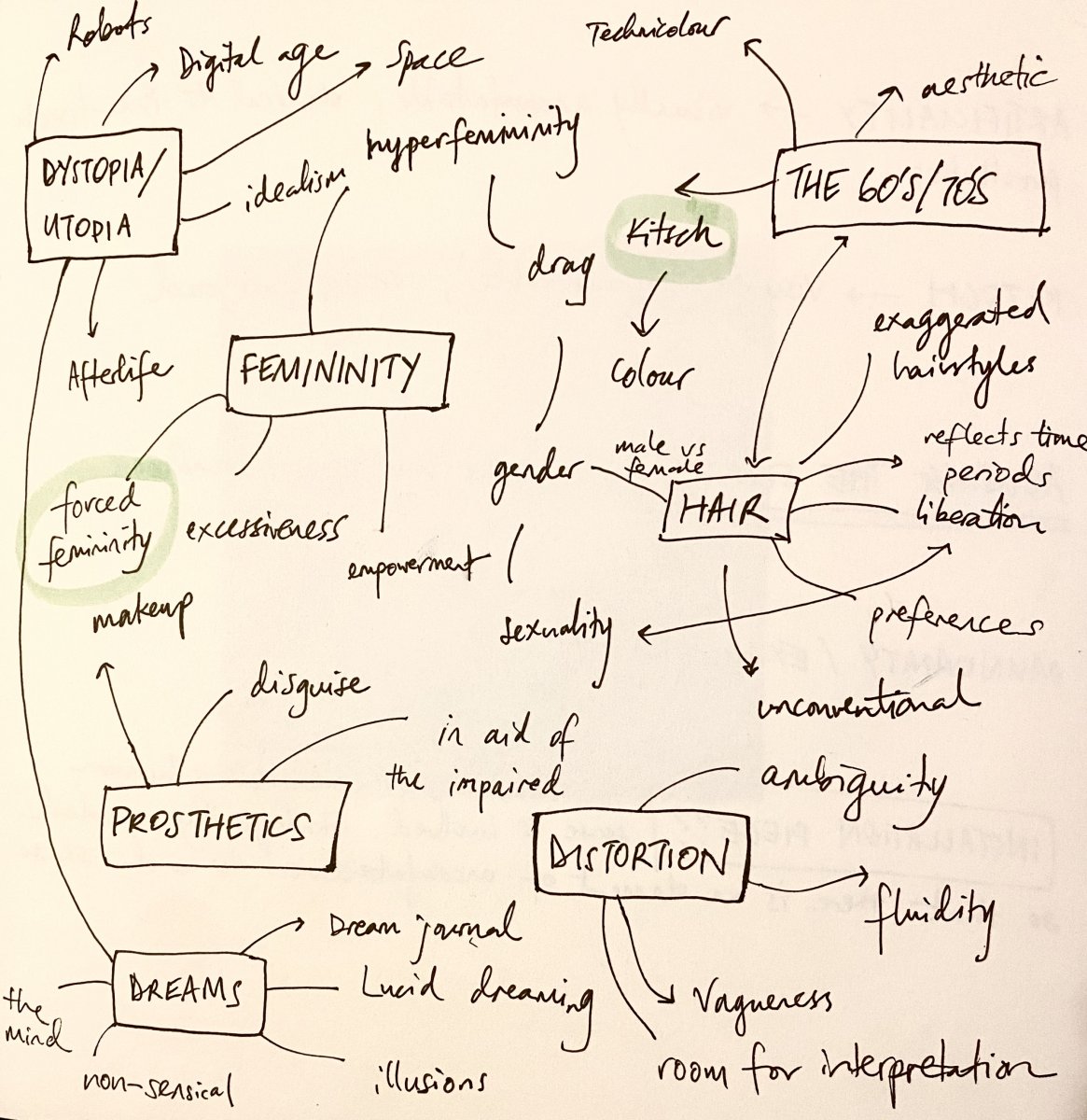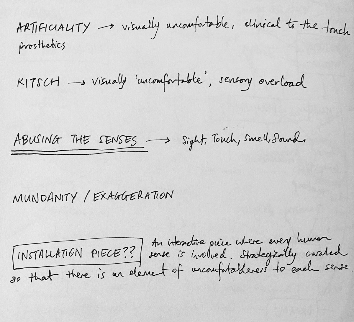 I have made a general brainstorm that highlight the various topics I’m interested in and have categorise these into the uncanny, artificiality, dystopia and Utopia, dreams and distortion. I’ve realized that I can group my interests together and intermingle them so it’s not just focus on one topic. Some of my interests are concept based while others are more from an aesthetic point of view and I am currently thinking about how to apply a certain aesthetic to a concept. For example, one of my interests in terms of the aesthetic is Kitsch, which I feel generates a certain response from an audience that is either repellent or uneasy. I feel as if the mismatched nature of kitsch almost acts as an attack to the eye and is visually confrontational. Most of the topics I’m interested in feature an element of uncomfortableness and uncanniness which is multi-sensory and hard to explain.