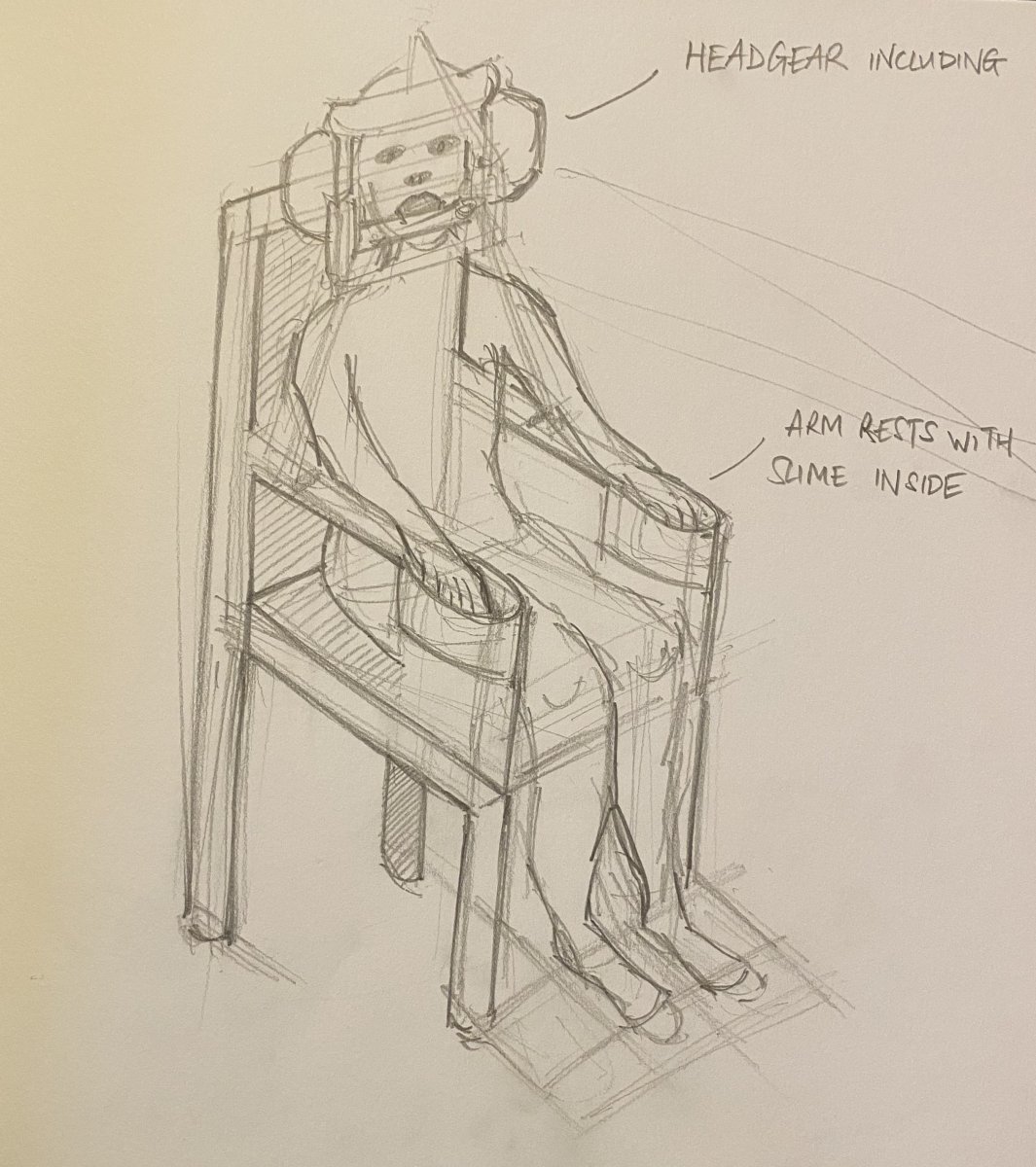 One idea I have been exploring is to create an almost torturous device that is designed to overstimulate the user is when it comes to touch, sight, taste, smell and sound. The contraption I have in mind resembles an electric chair that has been used as a torture device, paired with a phoropter which is used by opticians to examine the eye and more. The phoropter especially, reminds me of being constrained and controlled, and the fact that what you see is determined by what the optician chooses to show you.