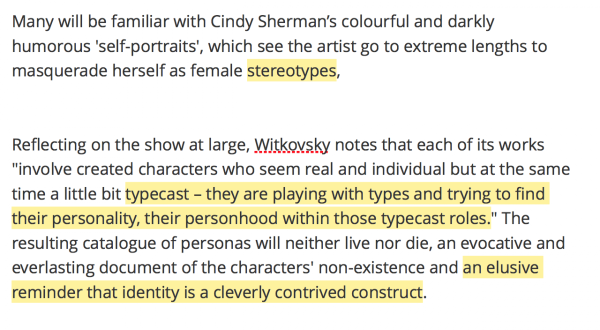 Cindy Sherman's stereotypical portrayals of figures and various demographics are very relevant to what I am investigating in my extension project. I have identified the 'teenage rebellion' stereotype that is commonly seen in films targeted towards teens. I am very interested in the transition period from pubescence into adolescence and the outbursts of revolt and rebellion that young people display.