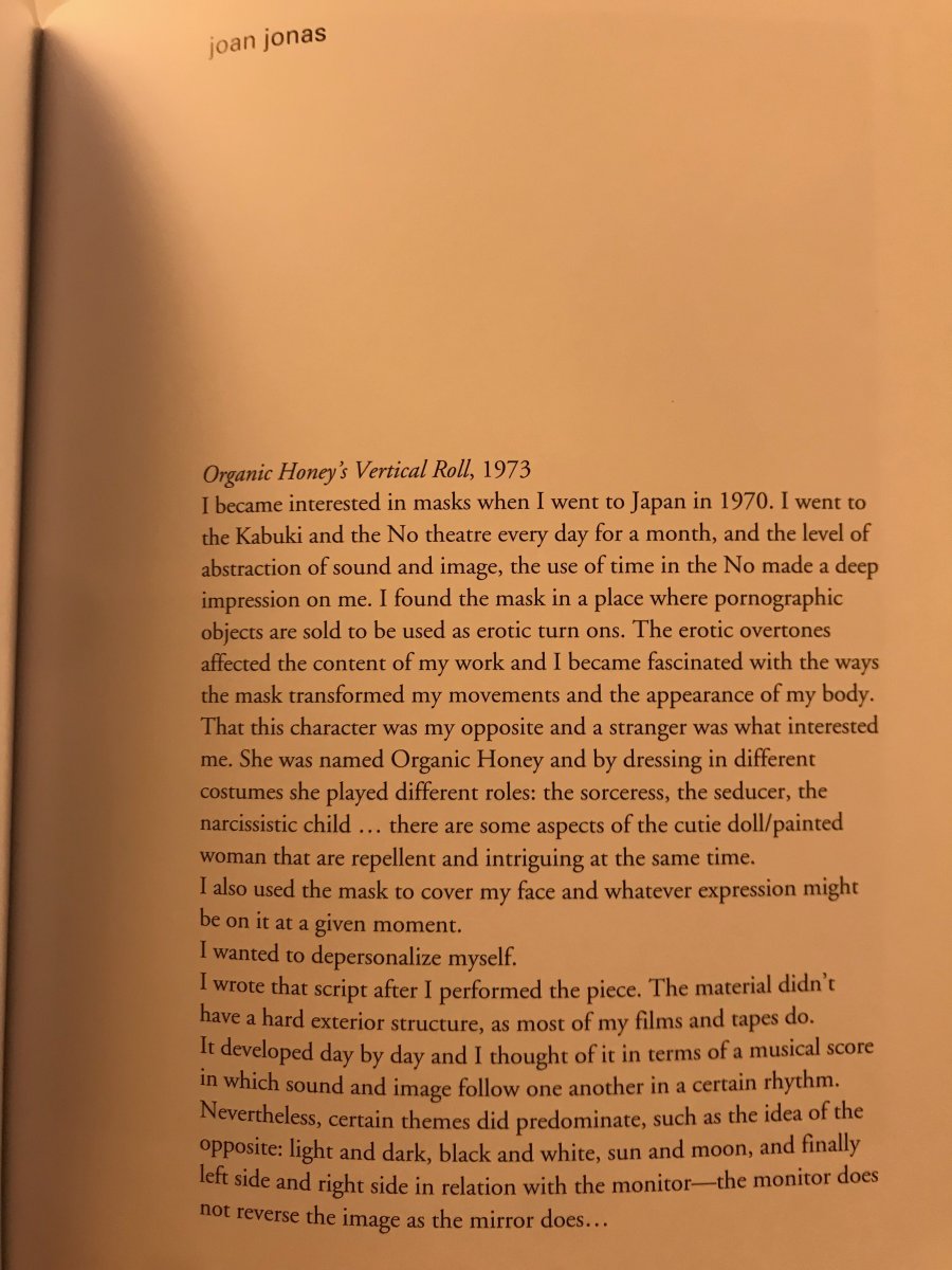 I feel I connect with this quote by Joan Jonas mainly because I too find masks fascinating. I am very interested in transformation of the human face/body and to me, masks create new personas that I am able to inhabit.