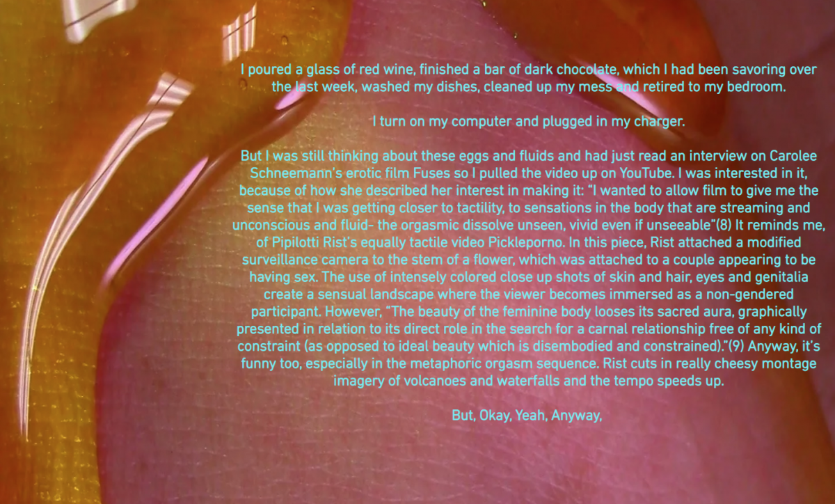 The reason I became interested in visual pleasure as a concept is because of Laura Mulvey’s challenge (I took it as a challenge, anyway) to create a cinema of visual pleasure for women. That essay made me think of all of the things that are pleasurable for me, and really freed me from trying to copy things that are current or that other people are doing, especially all of the macho, violent, nihilistic, or even minimalist work that has been so popular in my lifetime.